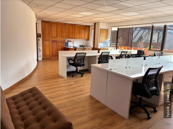 Ubicada cerca a la 109 con 19, piso 2, incluye mobiliario: escritorio, sillas, TV y mesa en sala de juntas, cortinas nuevas, mesa y sillas terraza, nevera pequeña.